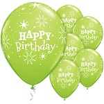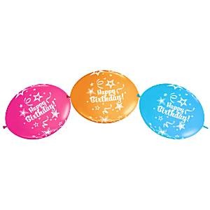 6 stk bursdagsballonger. Kan bruke både luft og helium i ballongene. 27 cm.