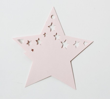 10 nydelige stjernetag som kan brukes som bordkort eller pynt. Det følger med hvite bånd.