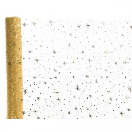 Organzaløper hvit med gullprikker, 9 meter, 36 cm bred. Snu løperen og prikkene er sølvfargede.
