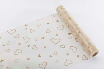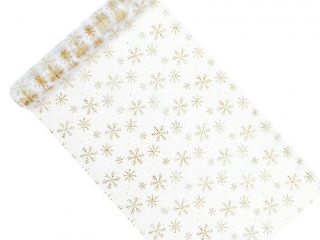 Organzaløper hvit med gullprikker, 9 meter, 36 cm bred. Snu løperen og prikkene er sølvfargede.
