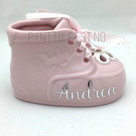 Babysko med navn og dato 14x7,5x8cm lys rosa