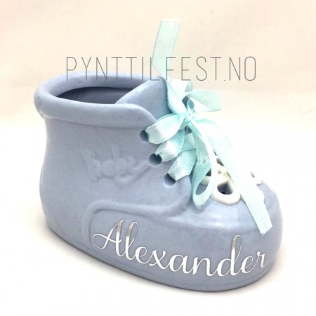 Navnet vil bli på den ene siden og datoen foran. Skoen kan brukes som pynt og dekor på festbordet eller som kakepynt.