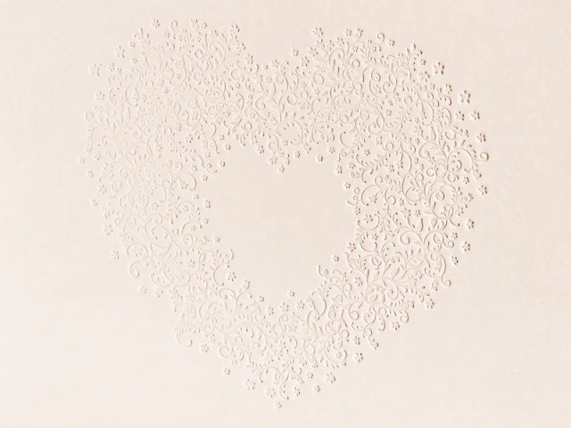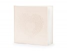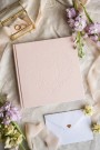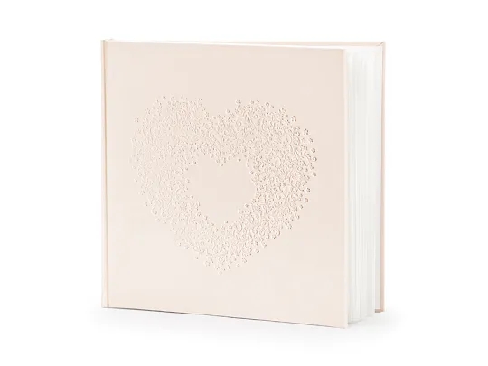 Gjestebok innbundet i lys rosa papir med ornament, størrelse ca. 20,5x20,5 cm, 22 sider, uten tekst.