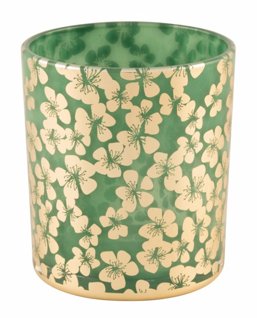 Lysglass grønn m/gullblomster 7x8cm Lysglass til telys