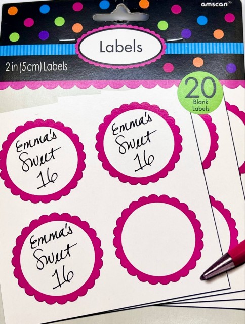 Designe dine partyposer og gaver med klistremerke etiketter. Disse klistermerker har fargede kanter og blank plass for deg å skrive et navn eller tekst. Hver pakke inneholder 20 selvklebende etiketter, hver 5cm. kan også brukes til å merke Candy skålene og merke koppene til gjestene i bursdagen.