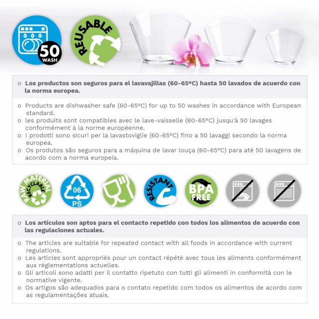 Elegante kopper, ideelle for alle desserter, bakverk eller småretter. Laget helt i Italia med høykvalitetsmateriale som gir styrke, glans og gjennomsiktighet. Temperaturtoleranse: -18°C/+70°C Tåler oppvaskmaskin opptil 50 ganger og laget av 100 % resirkulerbart materiale.