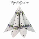 Servietter Lunsj Lavender wreath 20stk 20 stk 3-lags papirservietter til konfirmasjon, dåp og bryllup. NOK75,00 inkl. mva. På lager: 15 stk. Antall Kjøp Ønskeliste Del dette Produktinfo 20 stk 3-lags papirservietter til konfirmasjon, dåp og bryllup.
